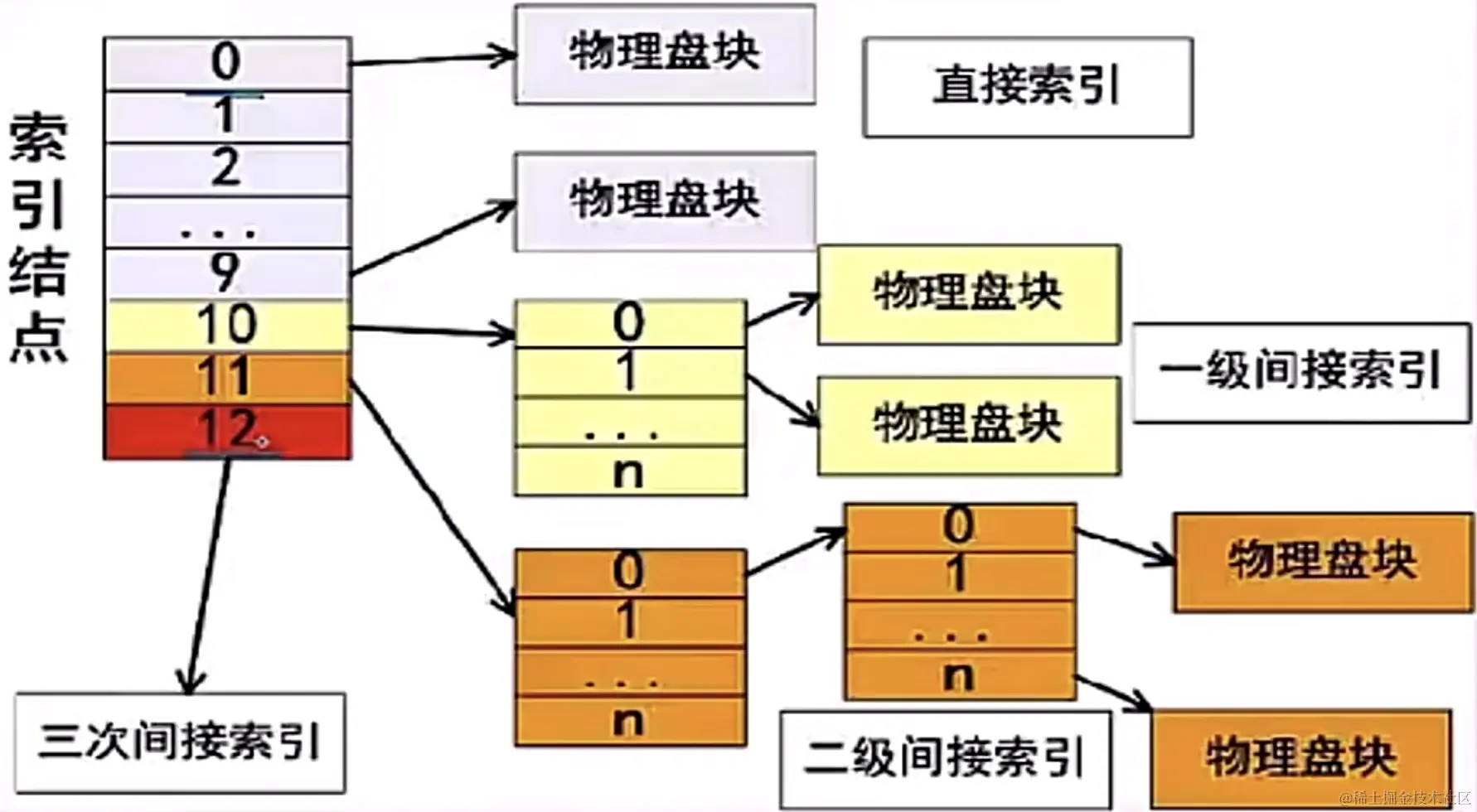 系统中有13个索引节点,0-9为直接索引,即每个索引节点存放的是内容,假设每个物理盘大小为4KB,共可存4KB*10=40KB数据;