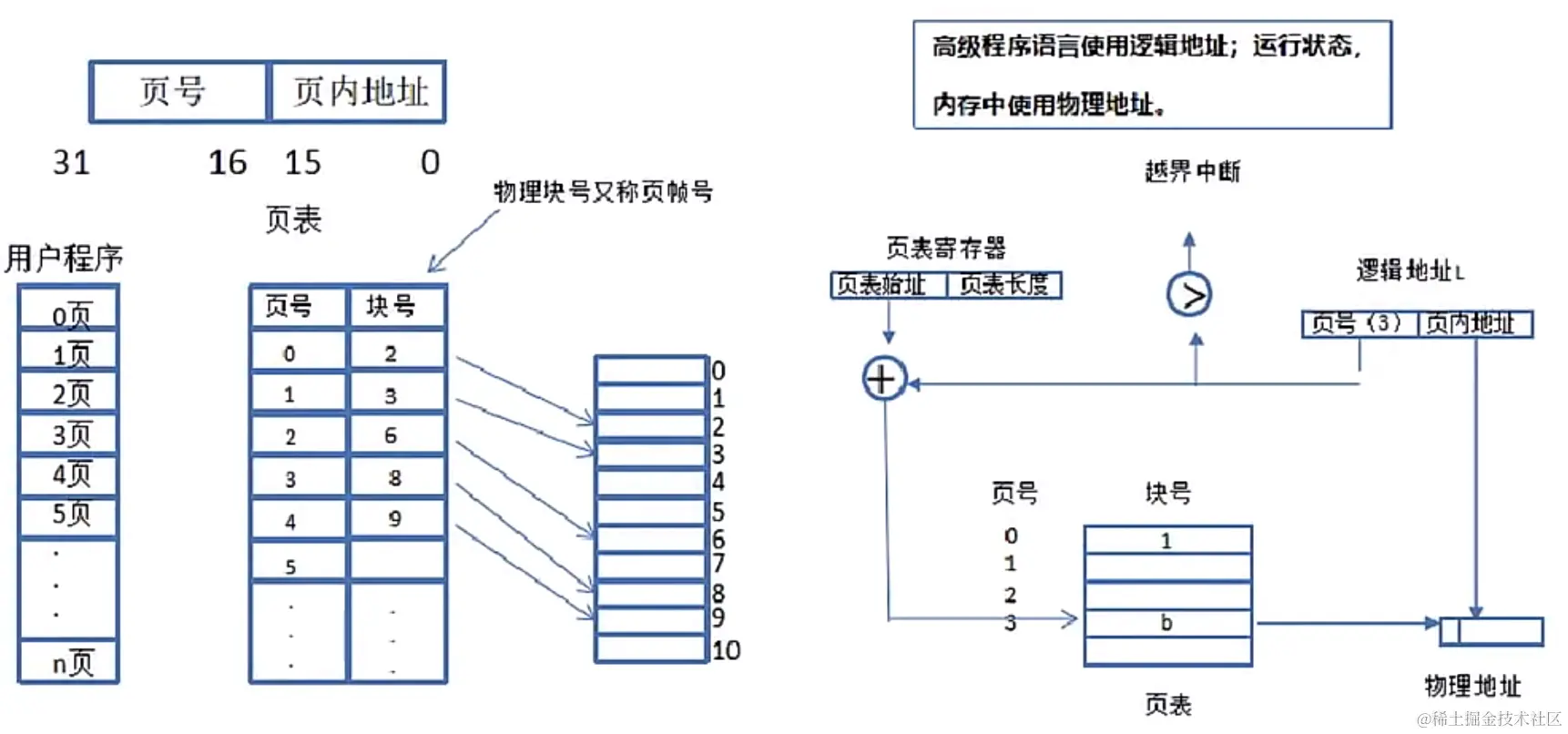 每个页分为页号和页内地址,页号用来和块号对应,代表存储的位置,大小可以代