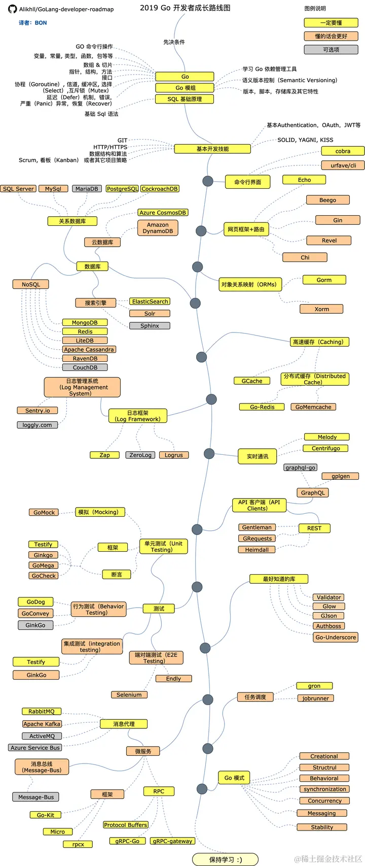 最近整理了一套完整的go开发学习课程,还比较全面,包含了入门、实战、性能优化、架构、面试和综合系列。基本涵盖了go开发的所有领域。下面是go的学习路线图,大家结合学习路线图根据自身情况选择性学习。