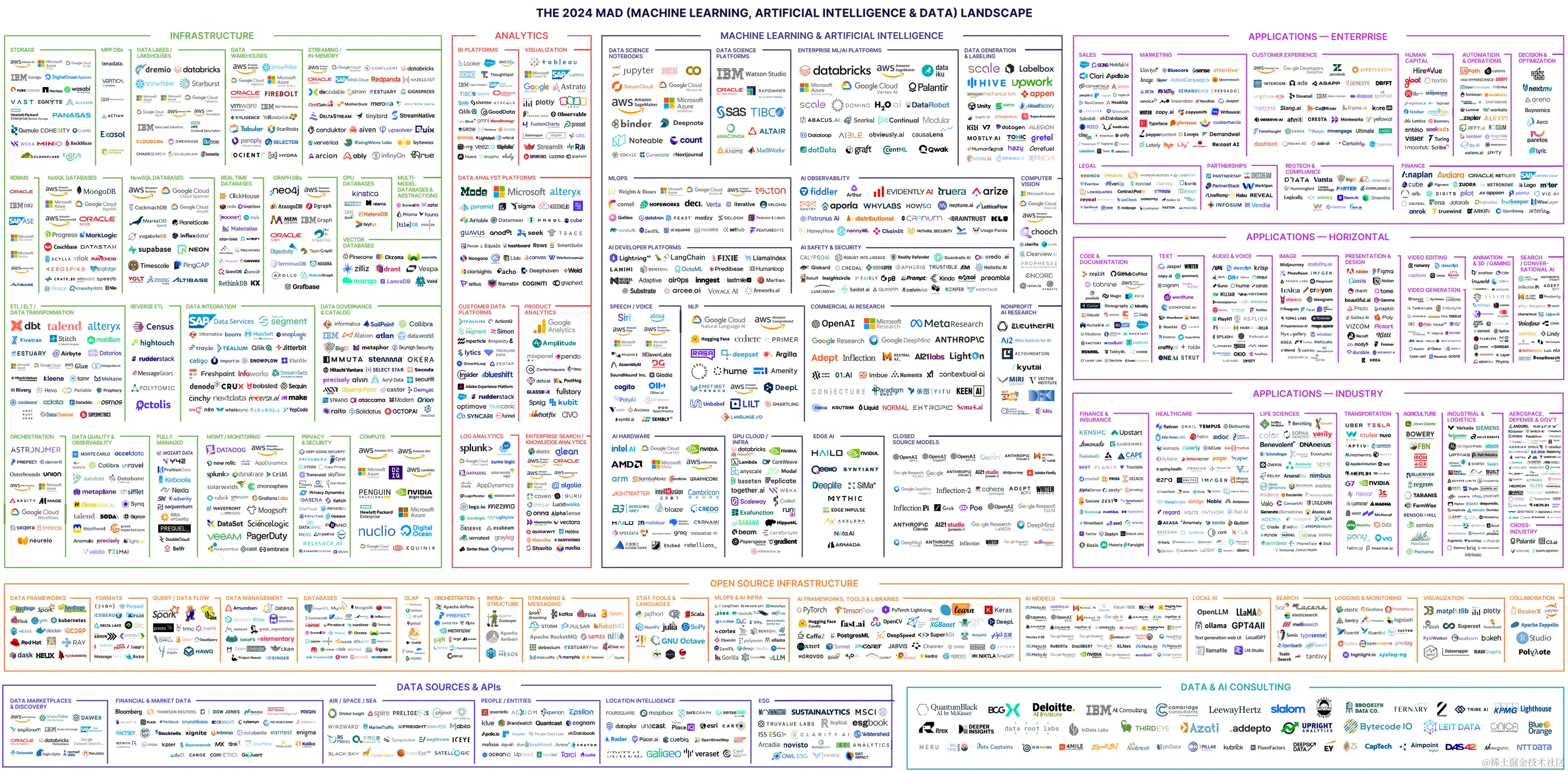 这里最大的更新是……对任何人都不意外……每个应用层公司现在都自称是“AI公司”——正如我们尽力过滤所见,这导致了您在今年MAD生态右侧看到的新标志的爆炸性增长