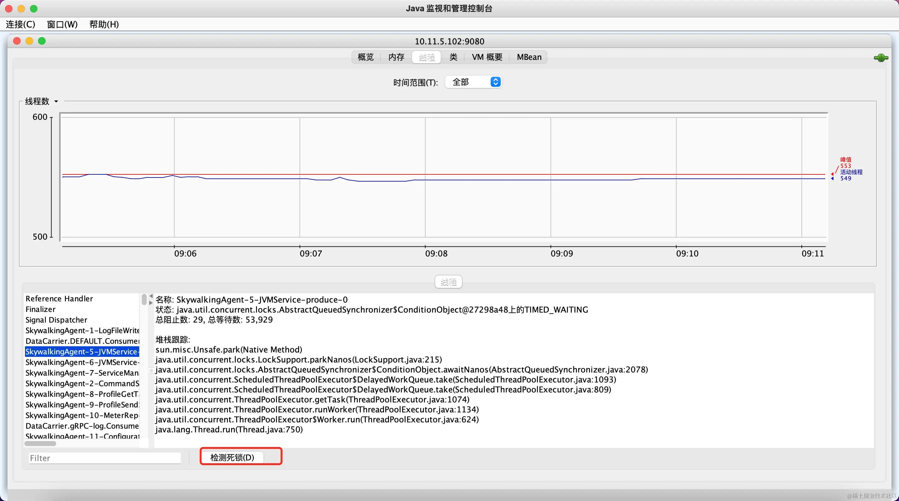 首先是用top、df、free等命令查看操作系统的基本情况。然后可以使用jmap、jstack等命令查看JVM线程栈和堆内存的情况。一般出现死锁时,会在线程栈的信息里出现deadlock字样。