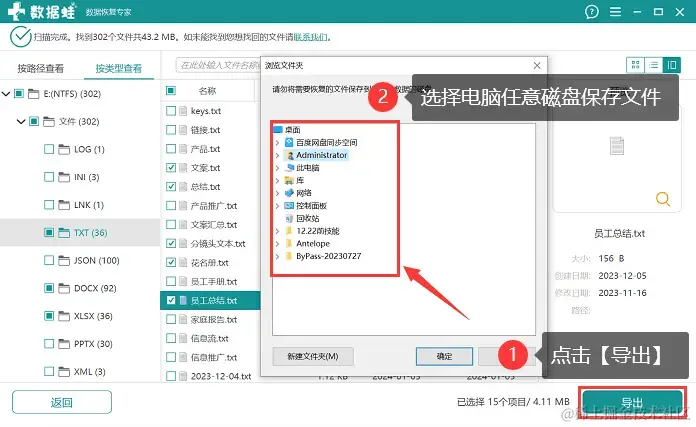 第4步:确保所有需要恢复的文件都勾选完毕,点击 【导出】,并选择将文件保存在电脑的磁盘上。