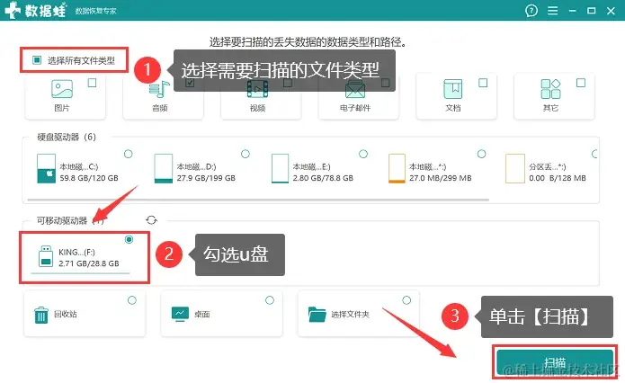 第2步:确定了要恢复的文件类型后,将其勾选上,并在下方将u盘勾选上,单击【扫描】;