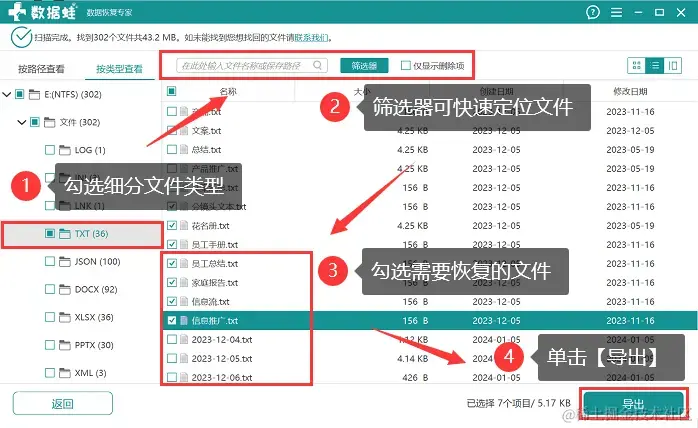 第3步:在扫描完成后,查看扫描到的文件,可以按照文件类型或路径查看,在右侧可对需要恢复的文件进行勾选,也可以直接借助【筛选器】快速对文件进行定位。