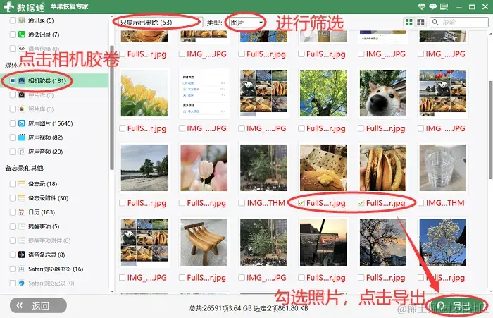 步骤3:扫描完成后,软件会列出所有找到的可恢复文件。点击**【相机胶卷】,你可以通过【筛选、预览】**功能查看照片,确保它们是你想要恢复的。然后,选择你想要恢复的照片。