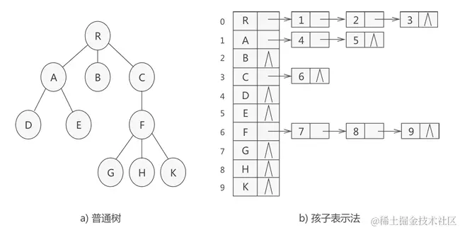如果结点没有孩子结点(叶子结点),则该结点的链表为空链表。