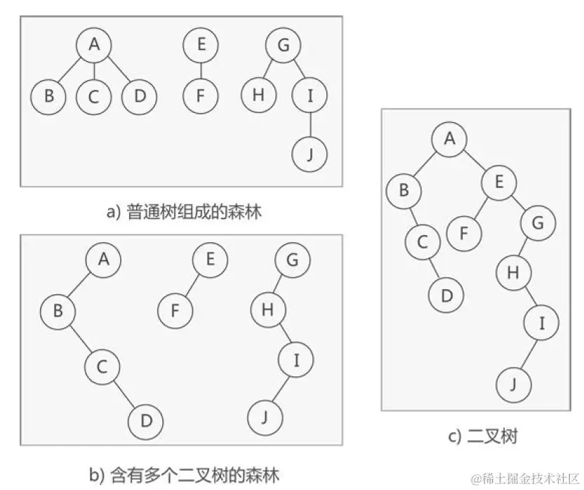 - 森林:若干棵互不相交的树的集合。