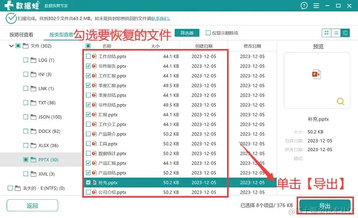 步骤4:勾选上所有需要恢复的文件后,点击【导出】,并将导出后的数据保存到与文件原保存位置有所区别的位置上。