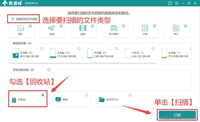 步骤2:在选择界面,将想要恢复的文件类型勾选上,并将【回收站】勾选上,单击【扫描】 ;