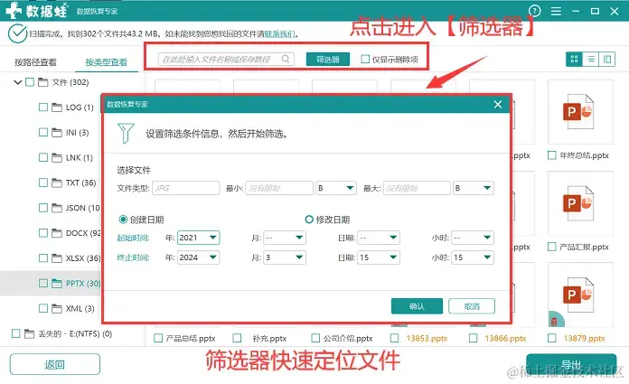 步骤3:等待扫描完成,用户可以对扫描到的数据进行查看,在查看时,如果文件比较多,可以直接借助 【筛选器】 ,搜索需要恢复的文件,定位到后,将它勾选上;