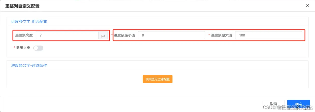 这种列类型可以设置进度条的高度,并且通过设置进度条的最大最小值来控制进度条的比例。给进度条的最小值设置为0,最大值设置为100,当我在表格数据中设置进度条的值为90时,就有90%的进度条会高亮显示同时在进度条后显示“90%”的字样。