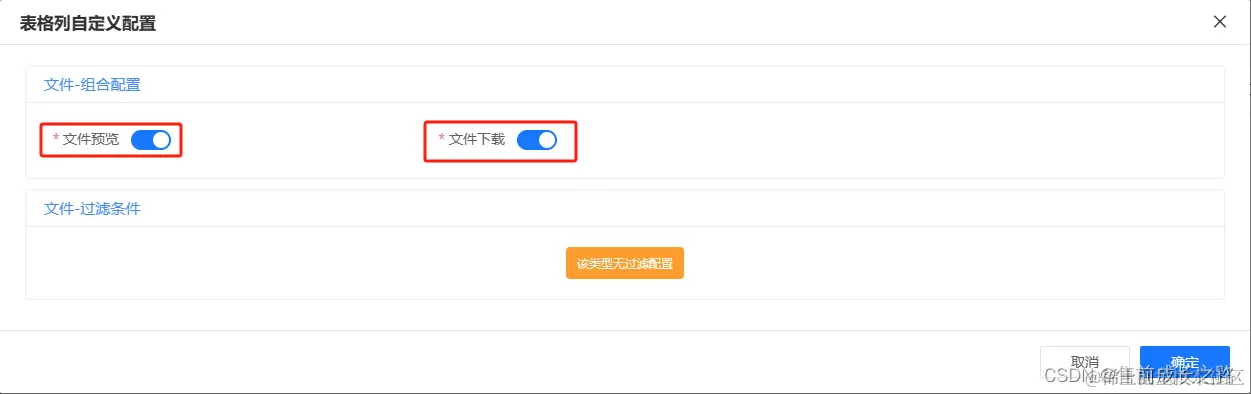这个列类型允许往表格中传输文件。我们可以在表格列设置中设置文件是否可以预览及下载。设置完成后,在“表格数据设置”中上传文件。当开启预览模式,点击眼睛样式的图标可以对文件进行预览。点击下载样式的图标可以下载文件。