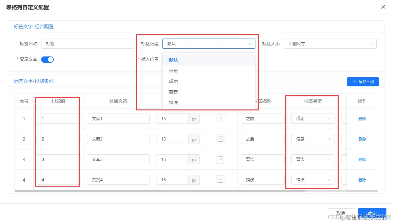 这种列设置方法与图标文字、图片文字设置相同。标签的类型一共有“默认”、“信息”、“成功”、“警告”以及“错误”五种类型。这五种类型的标签颜色不一样所代表的意义也不一样,根据需要的内容选择不同的标签。
