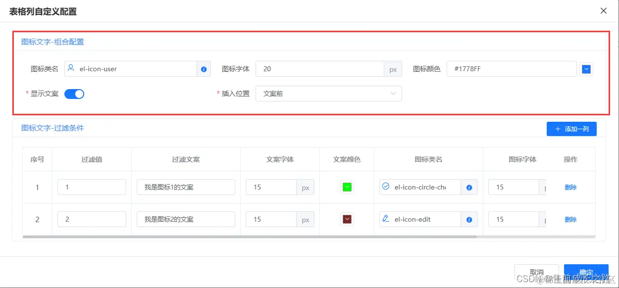 图标可以用来区别不同类型的数据。这种列设置可以展示从浮木云内置的图标库中选择的图标并为图标添加文案,同时支持设置图标的大小和颜色。在表格列设置中,图标、图片、标签、进度条文字包含“组合配置”和“过滤条件”。