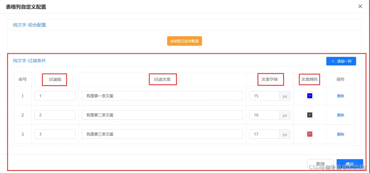 在组合配置中设置的内容即使我没有给表格设置数据值,它也会默认显示在表格中。我们可以使用 “组合配置” 设置统一的内容,而通过设置 “过滤条件”实现内容个性化展示。