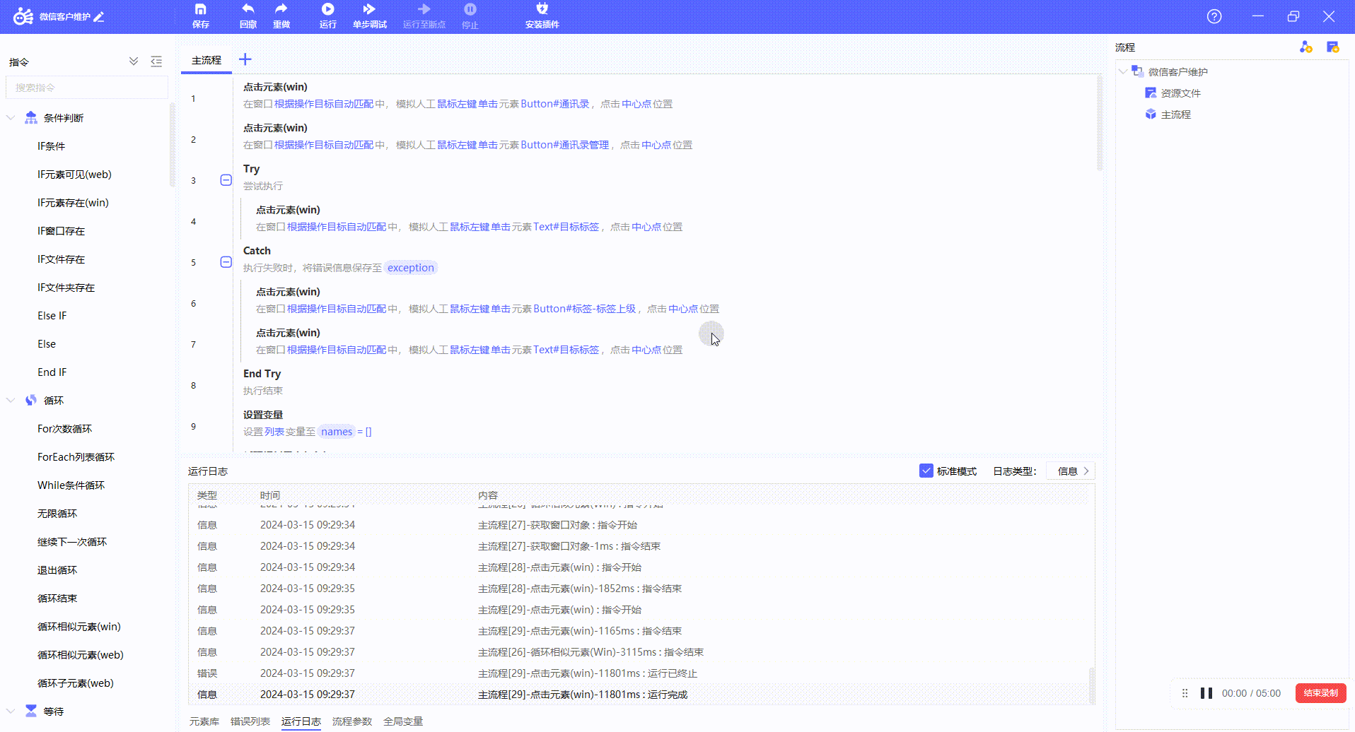 打开微信,通过“捕获元素”获取元素,再通过桌面自动化“点击元素(win)”依次点击,通讯录和通讯录进入界面