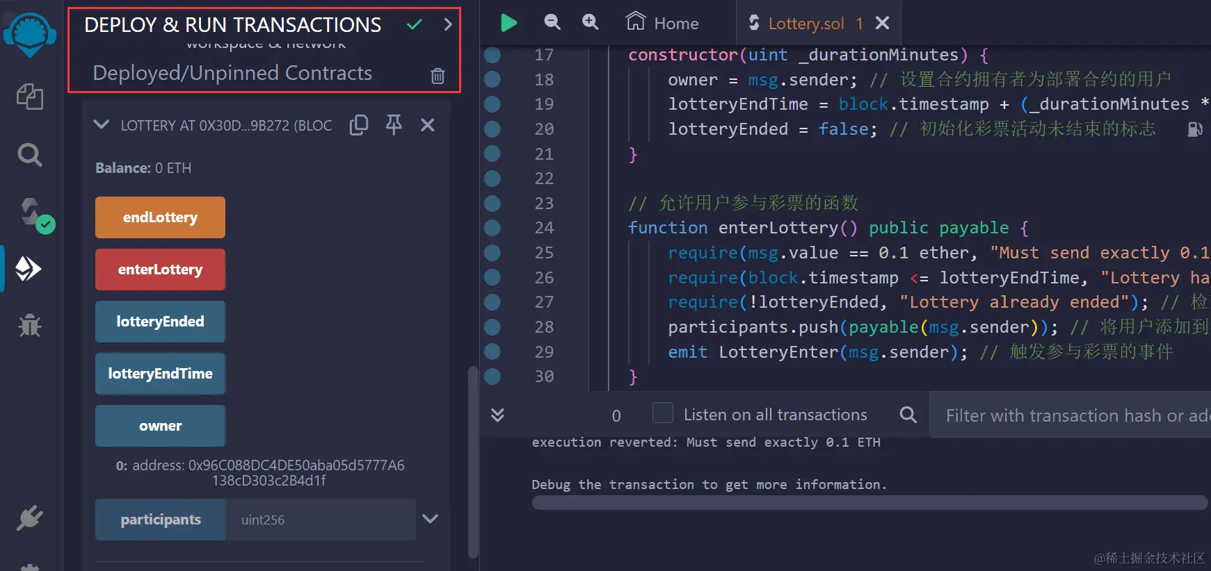 participants[winnerIndex].transfer(prize); // 将奖金转账给中奖者