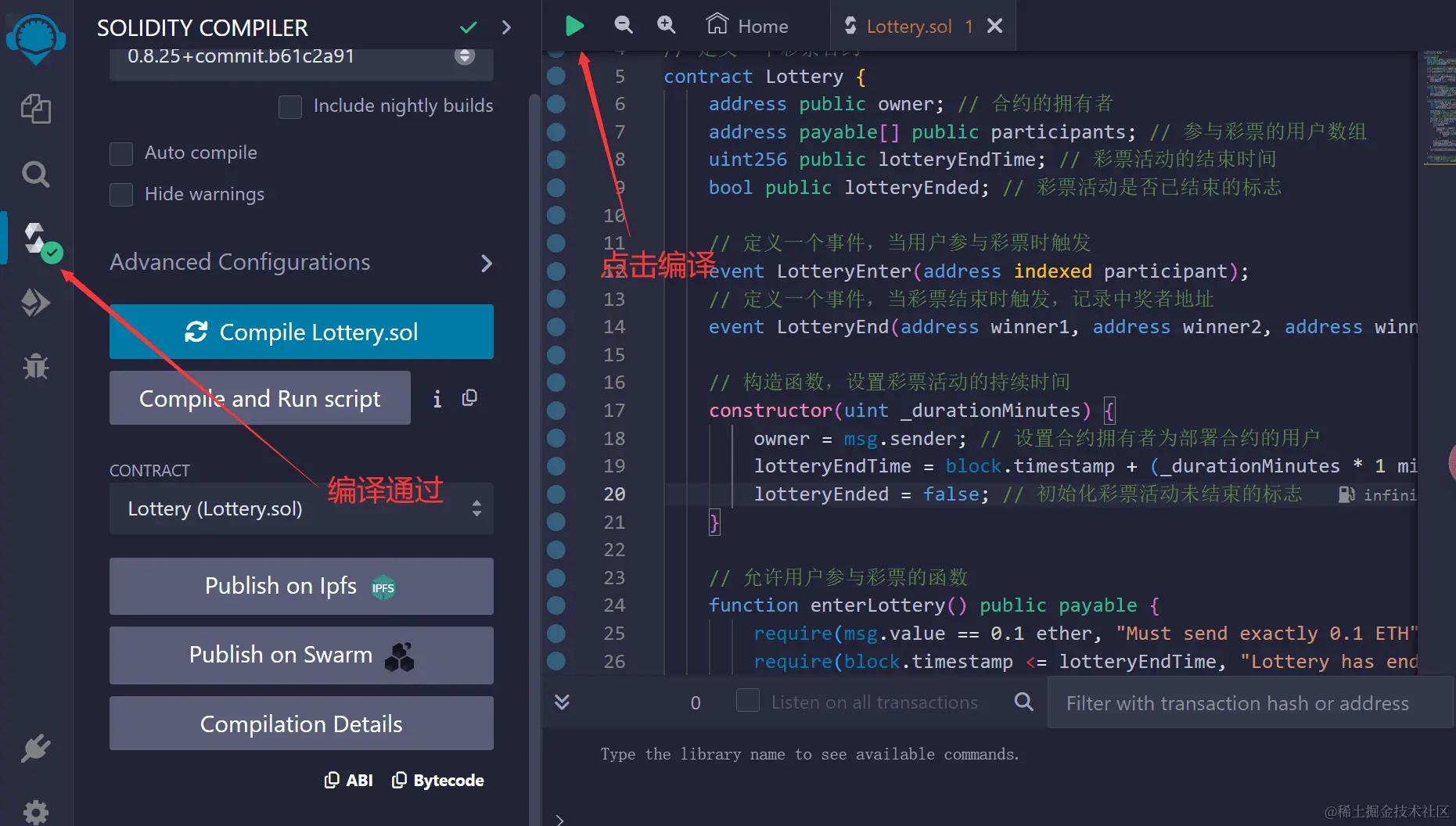 所以我们只需要编写智能合约的代码,Remix会自动帮我们编译为EVM字节码,发布到区块链中。