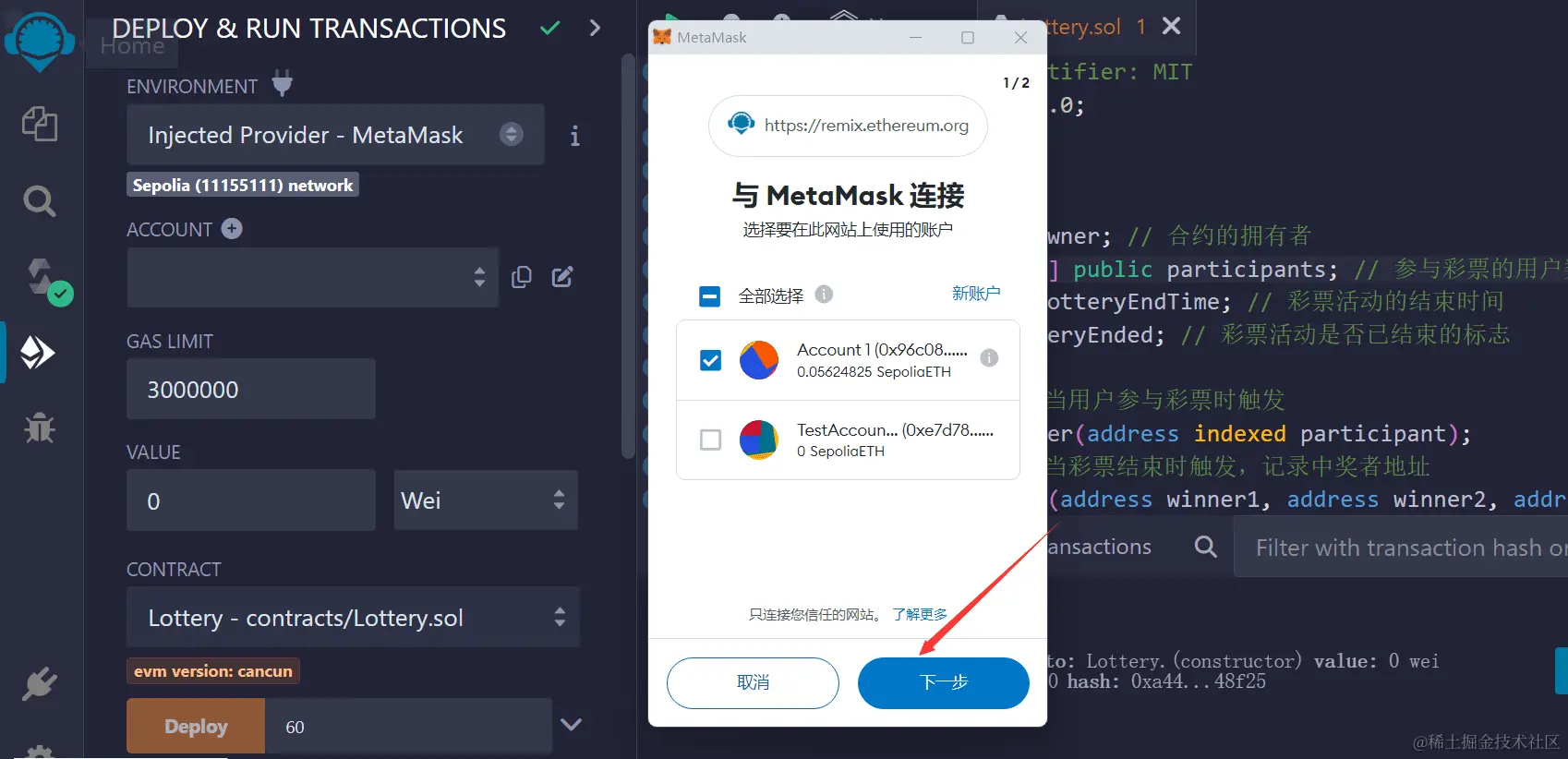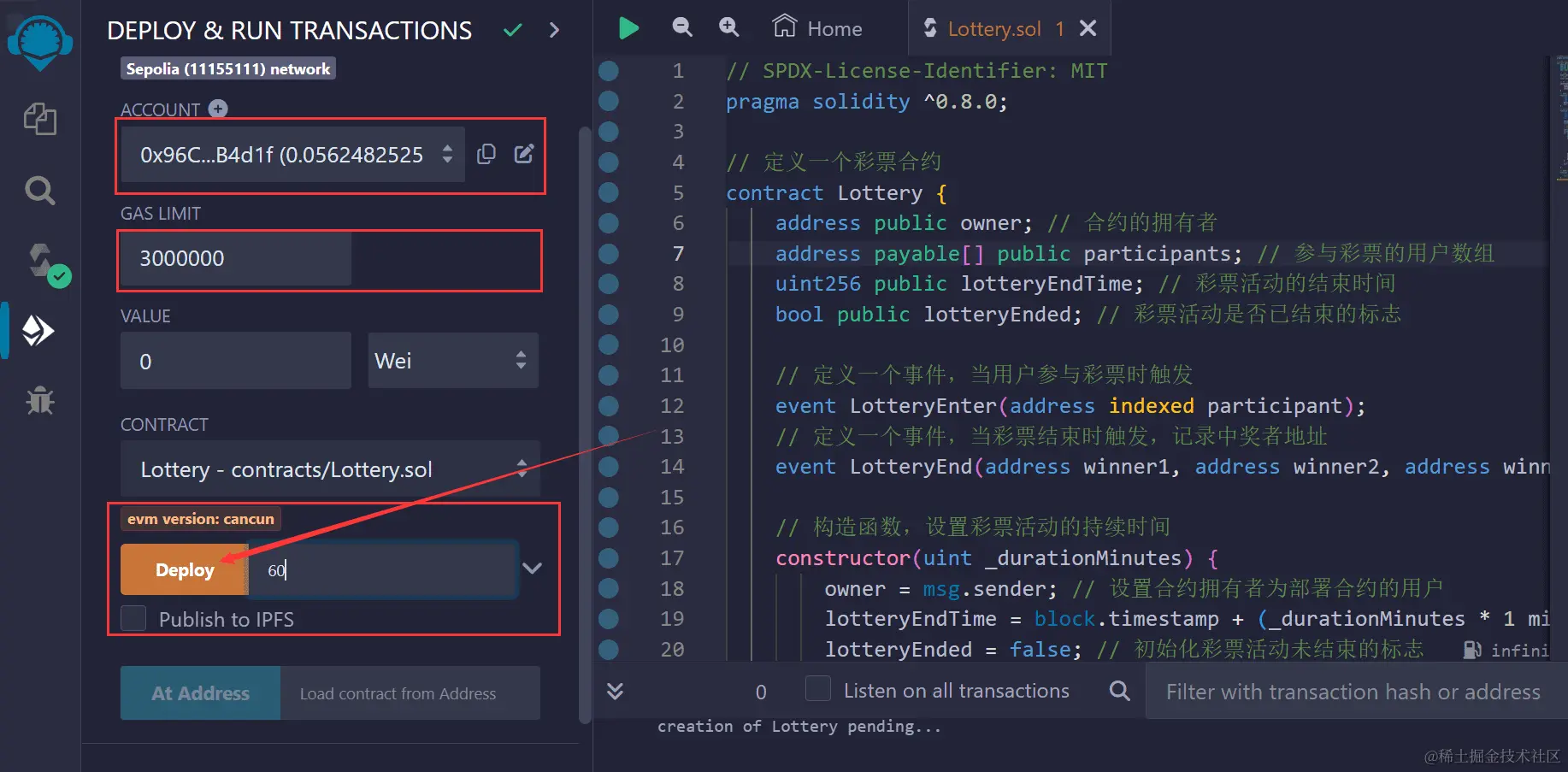 连接成功后,左侧可以看到我们的账户地址、余额,汽油费上限。在Deploy右侧可以看到我们在构造函数中设置的活动持续时间,设置为60min,点击Deploy发布。