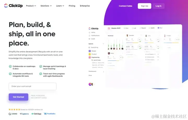 ClickUp 比一般的项目管理软件更能满足每个开发人员的需求 - 从任务自动化功能和错误跟踪模板到方便的 AI 写作助手。如果您遵循敏捷项目管理原则,请利用ClickUp 仪表板获得完整的项目可见性,并使用路线图、冲刺和积压工作与您的团队协作。