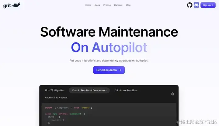 Grit.io 自动化技术债务管理。专门用于处理代码迁移和依赖项升级等任务。有了 Grit,我们不再需要专门进行迁移的冲刺。对于处理遗留系统或频繁代码迁移的团队来说,Grit 是理想的选择。它使您可以更轻松地了解最新的技术更新,而不会破坏正在进行的项目。