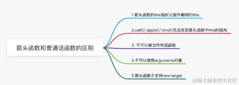 1箭头函数的this指向父级作用域的this 2.call(apply()/bind()无法改变箭头函数中this的指向 箭头函数和普通话函数的区别 3.不可以被当作构造函数 4.不可以使用arguments对象 5.箭头函数不支持new.target