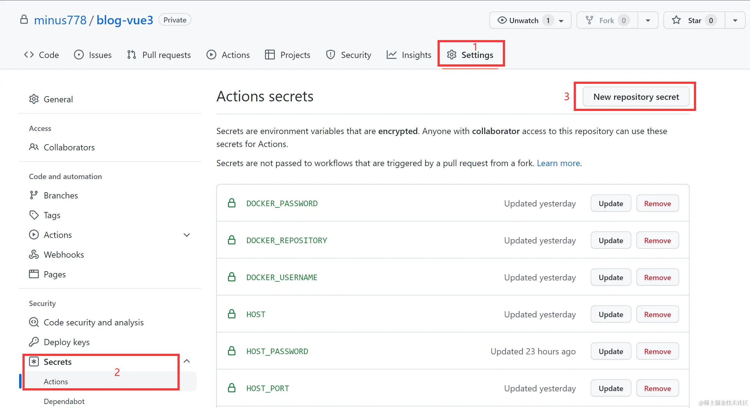 首先打开github对应的项目仓库,点击setting->Secrets->Actions