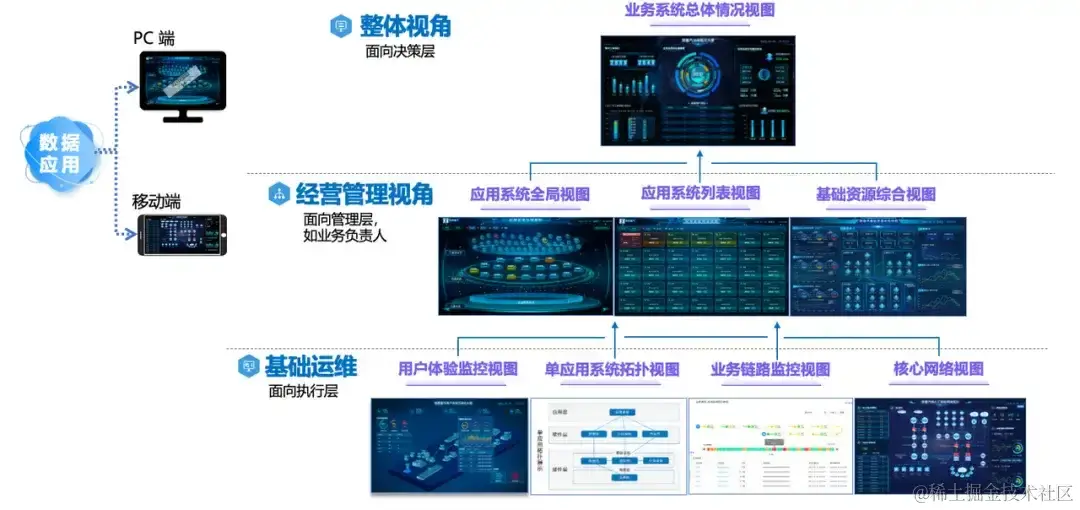 云智慧运维监控指标体系根据整体视角、经营管理和基础运维视角提供不同监控视图,视角涵盖决策层、管理层和执行层,视图将各种数据指标以图表、地图等方式通过可视化大屏呈现。
