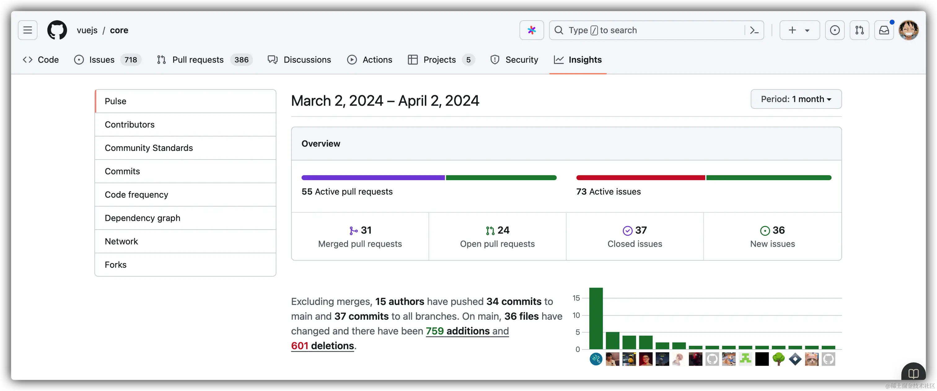 - 除了合并操作外,共有 15 位作者向主分支推送了 34 次提交,以及向所有分支推送了 37 次提交。