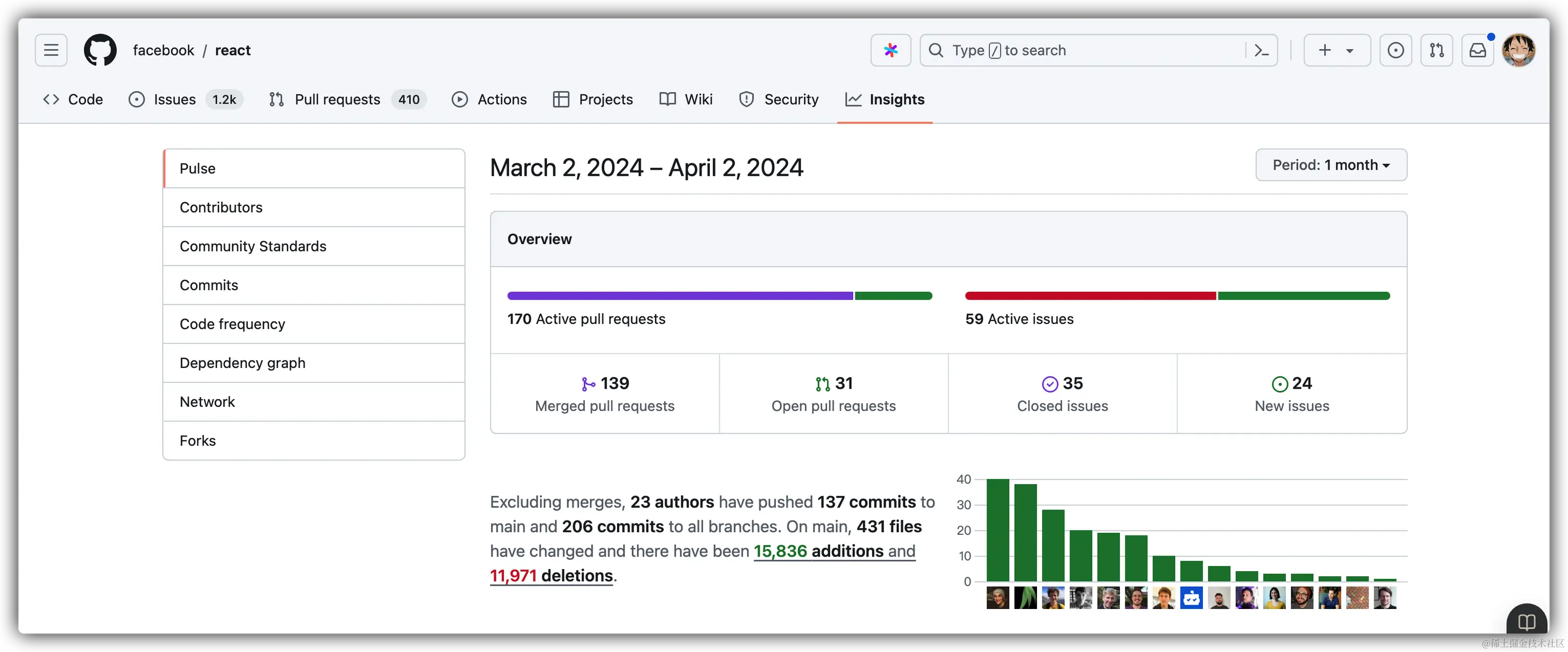 - 除了合并外,23 位作者向主分支推送了 137 次提交,向所有分支推送了 206 次提交。