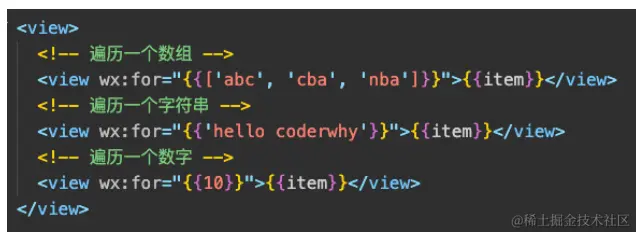 ◼ 在组件中,我们可以使用wx:for来遍历一个数组 (字符串 - 数字)
