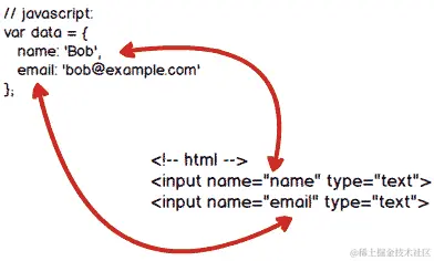 当用户填写表单时,View的状态就被更新了,如果此时可以自动更新Model的状态,那就相当于我们把Model和View做了双向绑定关系图如下