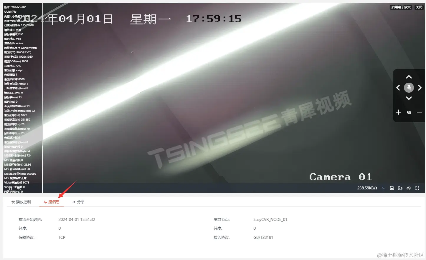 因为在播放器中已经包含了关于视频流的详细信息,所以在【流信息】栏中,平台去除了重复的数据,只显示了推流开始时间、集群节点、经纬度信息、传输协议和接入协议等信息,如下所示:
