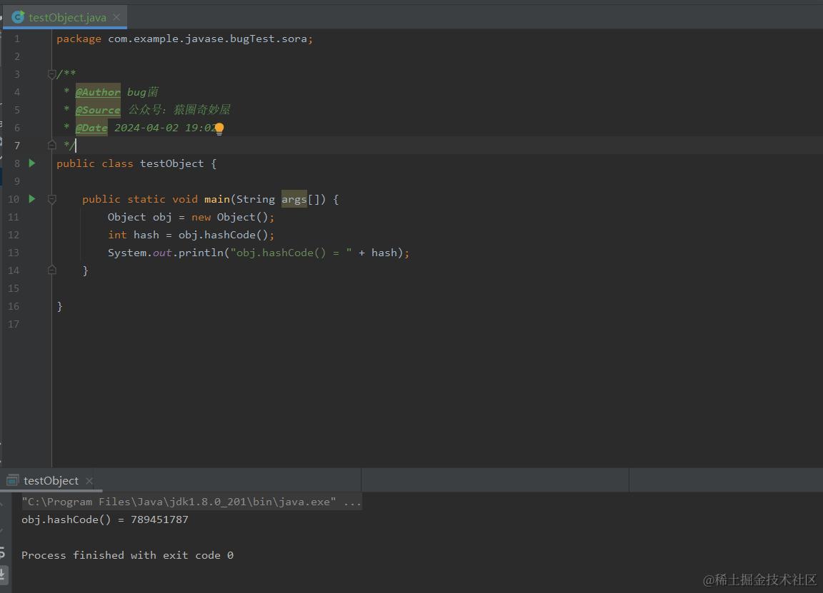 hashCode()- 返回对象的哈希码值,该值在equals方法中用于比较对象的相等性。默认实现返回对象的系统标识符。
