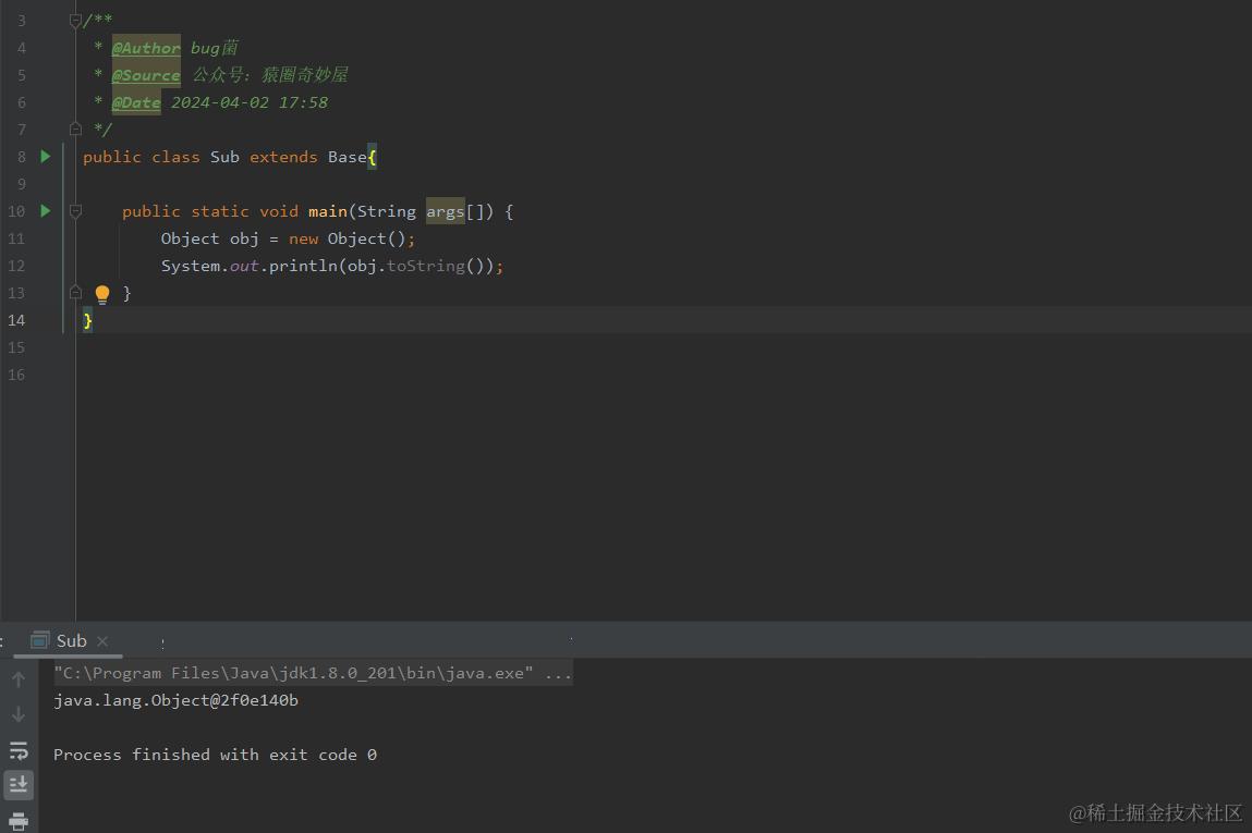 因此,toString() 方法返回的字符串将类名和对象的哈希码连接在一起,以 @ 符号分隔。这样的字符串并不是特别有用,因为它不提供对象的实际内容信息,但是它可以用于快速检查对象的标识。