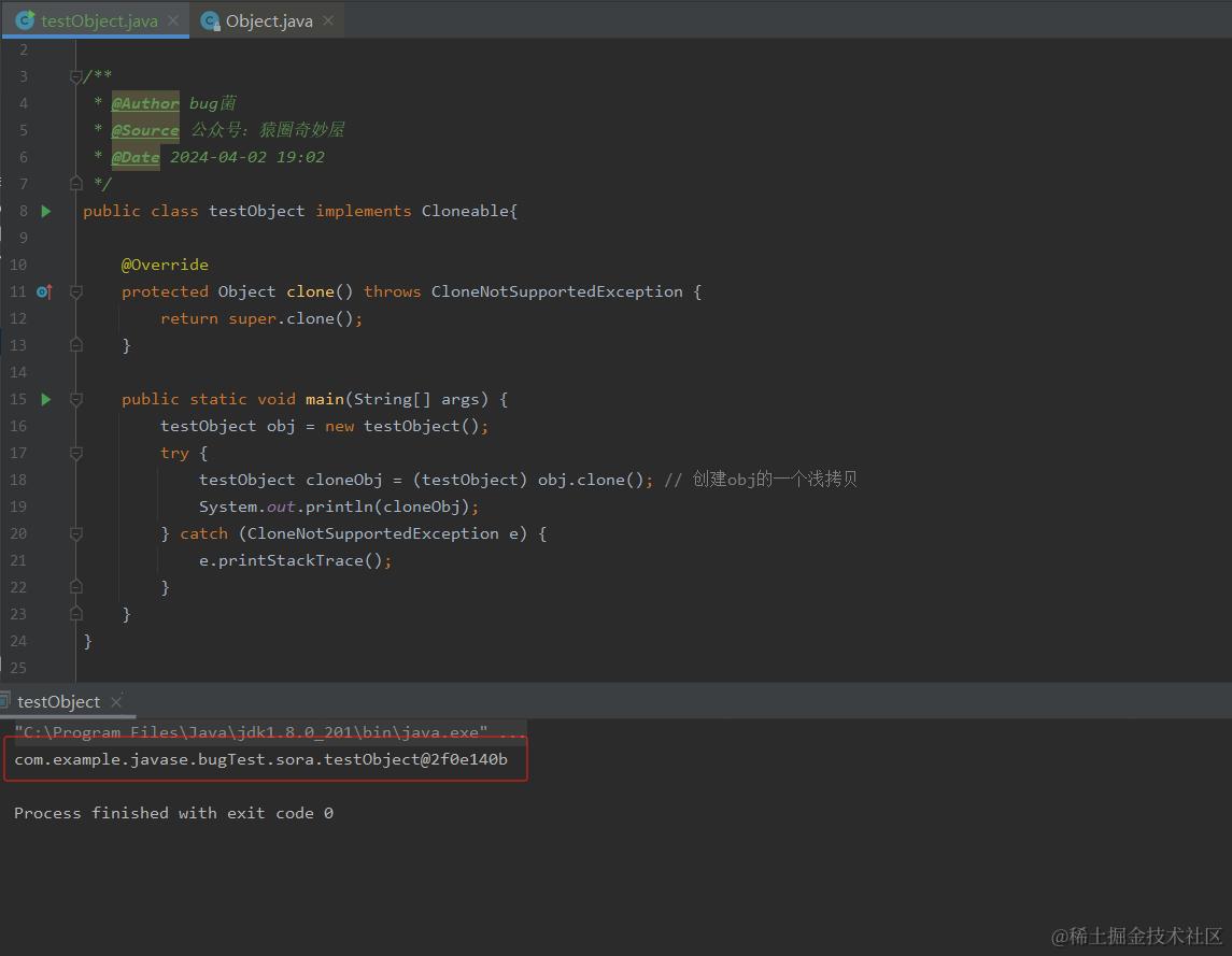 这段代码主要展示了 Java 中如何实现对象的克隆操作,并测试克隆对象与原对象的相等性及哈希值。以下是详细解释: