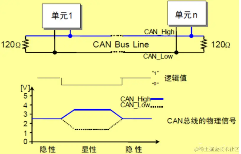 CAN控制器根据两根线上的电位差来判断总线电平。总线电平分为显性电平和隐性电平,二者必居其一。发送方通过使总线电平发生变化,将消息发送给接收方。