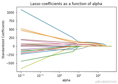 这段代码将生成一个图表,展示随着alpha值的变化,各特征的系数是如何变化的。通过此图,我们可以更直观地理解正则化强度对模型系数的影响,以及哪些特征在模型中更重要。