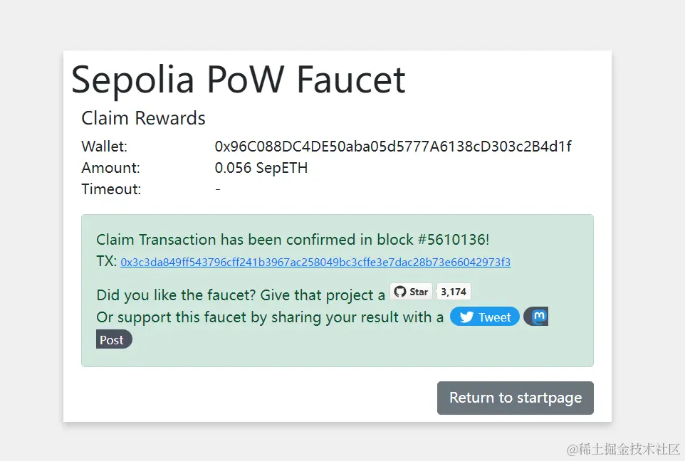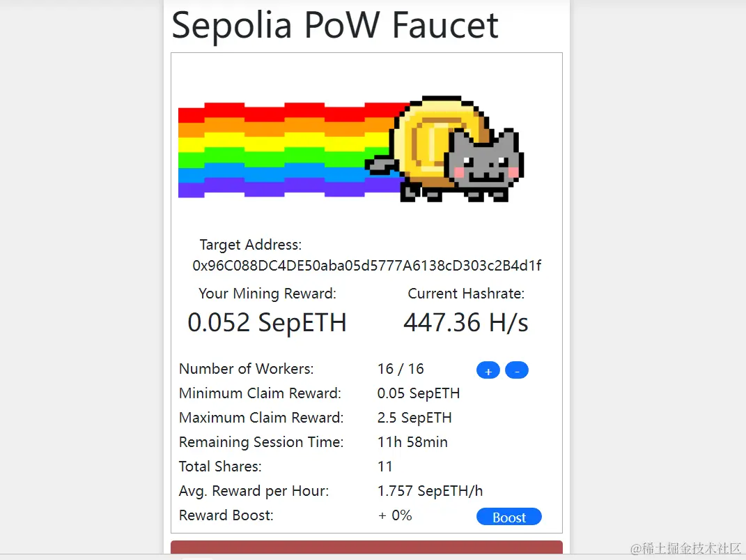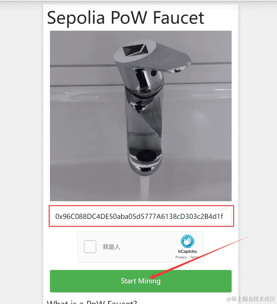 打开水龙头网站,输入我们的地址,开始挖矿。