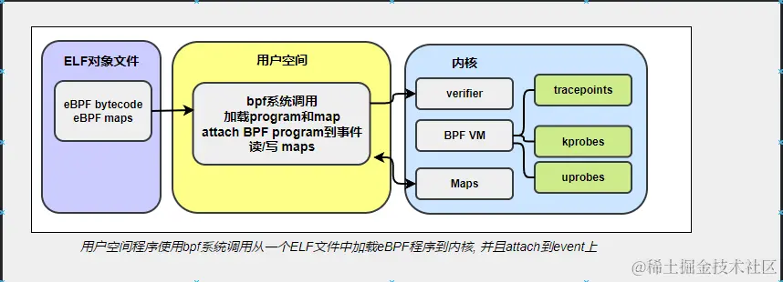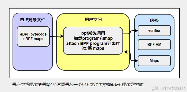 如下图所示用户空间程序读取这个BPF程序编译后产生的ELF格式文件,通过verifier的校验之后才能加载到内核。