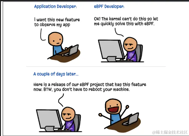 有了eBPF,你可以把自定义的“沙盒”代码附到内核通过符号表导出的几乎每个函数上,而且不用担心搞崩内核。实际上eBPF特别强调安全性,尤其是当你要越过用户空间边界的时候。内核验证器可不会加载任何发现无效指针引用或者堆栈太大的eBPF程序。而且不让用循环(除非在编译时就知道循环次数),在生成的字节码里只允许调用特定的eBPF helper函数。eBPF程序保证会在某个时候停下来,绝对不会狂占系统资源。当然,有人可能觉得eBPF相对于“自由度”超高的内核模块来说有点限制,但在我看来,权衡的结果更可能偏向eBPF,主要是因为eBPF程序保证不会对内核造成伤害。当然啦,好处还不止这些。