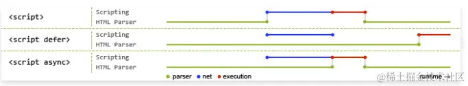 ●脚本是否并行执行:async属性,表示后续文档的加载和执行与js脚本的加载和执行是并行进行的,即异步执行;defer属性,加载后续文档的过程和js脚本的加载(此时仅加载不执行)是并行进行的(异步),js脚本需要等到文档所有元素解析完成之后才执行,DOMContentLoaded事件触发执行之前。