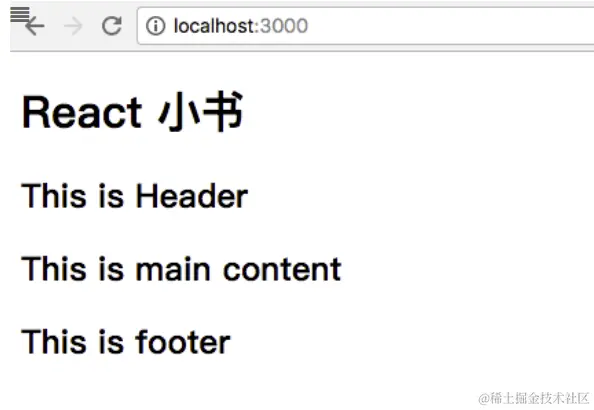 我们可以直接在 Header 标签里面直接使用 Title 标签。就像是一个普通的标签一样。React.js 会在 <Title /> 所在的地方把 Title 组件的 render 方法表示的 JSX 内容渲染出来,也就是说 <h1>React 小书</h1> 会显示在相应的位置上。如果现在我们在 Header 里面使用三个 ,那么就会有三个 显示在页面上。