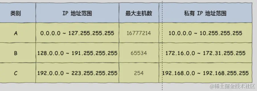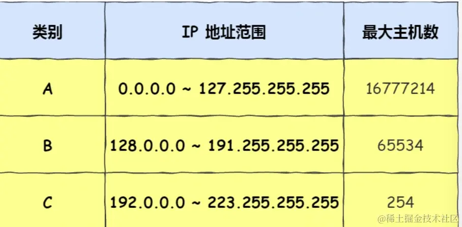 我们可以用下面这个表格, 就能很清楚的知道 A、B、C 分类对应的地址范围、最大主机个数。