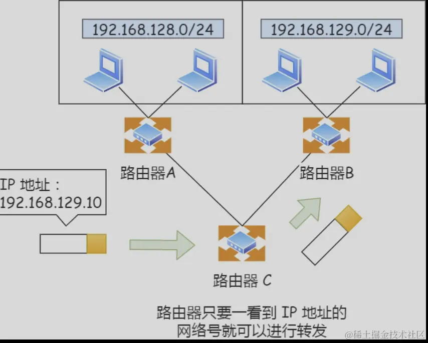 路由器寻址工作中,也就是通过这样的方式来找到对应的网络号的,进而把数据包转发给对应的网络内