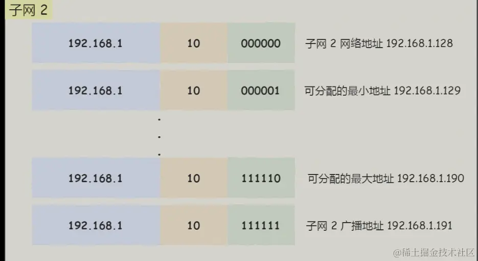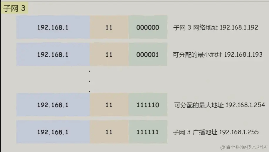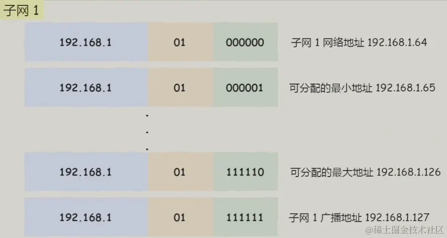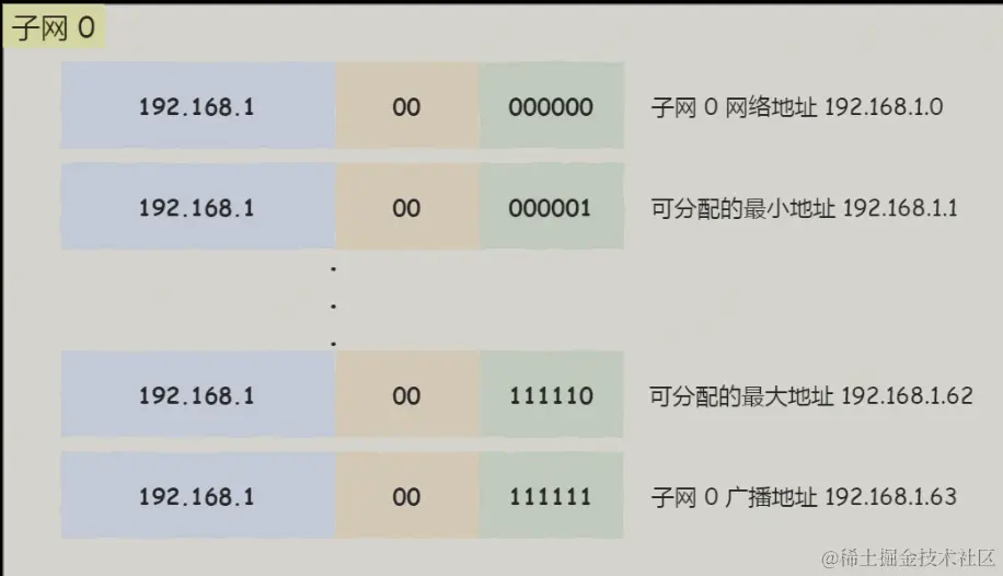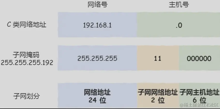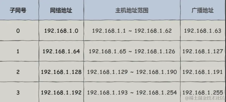 假设对 C 类地址进行子网划分,网络地址 192.168.1.0,使用子网掩码 255.255.255.192 对其进行子网划分。