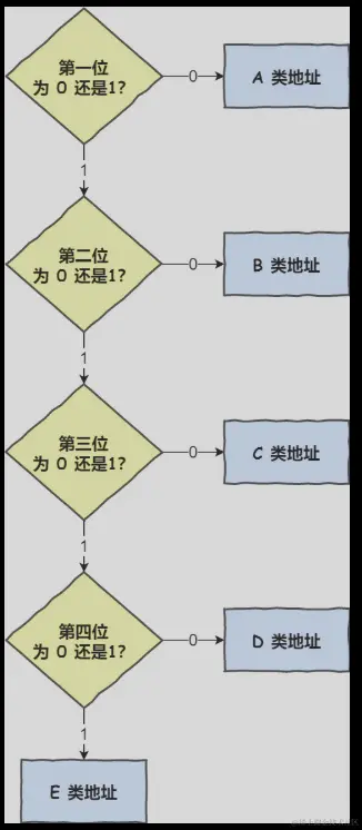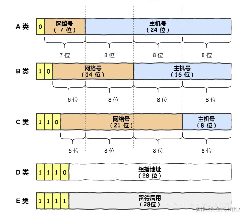 IP 地址分类成了 5 种类型,分别是 A 类、B 类、C 类、D 类、E 类。