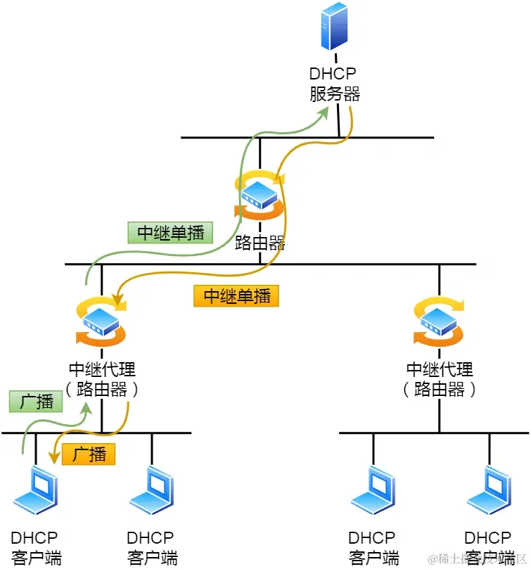 所以,为了解决这一问题,就出现了 DHCP 中继代理。有了 DHCP 中继代理以后,对不同网段的 IP 地址分配也可以由一个 DHCP 服务器统一进行管理。