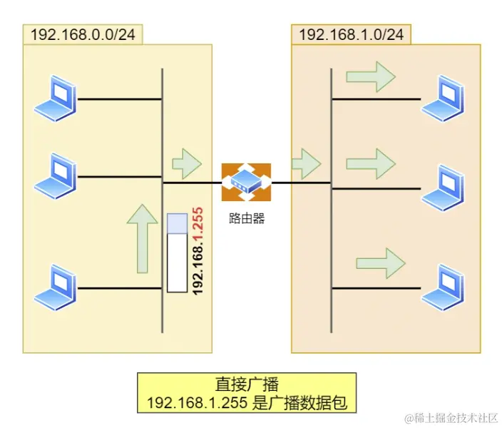 在不同网络之间的广播叫做直接广播。例如网络地址为 192.168.0.0/24 的主机向 192.168.1.255/24 的目标地址发送 IP 包。收到这个包的路由器,将数据转发给 192.168.1.0/24,从而使得所有 192.168.1.1~192.168.1.254 的主机都能收到这个包(由于直接广播有一定的安全问题,多数情况下会在路由器上设置为不转发。) 。