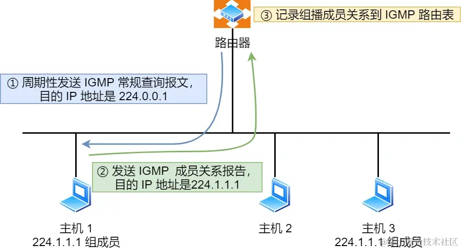 - 主机1 和 主机 3 收到这个查询,随后会启动「报告延迟计时器」,计时器的时间是随机的,通常是 0~10 秒,计时器超时后主机就会发送 IGMP 成员关系报告报文(源 IP 地址为自己主机的 IP 地址,目的 IP 地址为组播地址)。如果在定时器超时之前,收到同一个组内的其他主机发送的成员关系报告报文,则自己不再发送,这样可以减少网络中多余的 IGMP 报文数量。